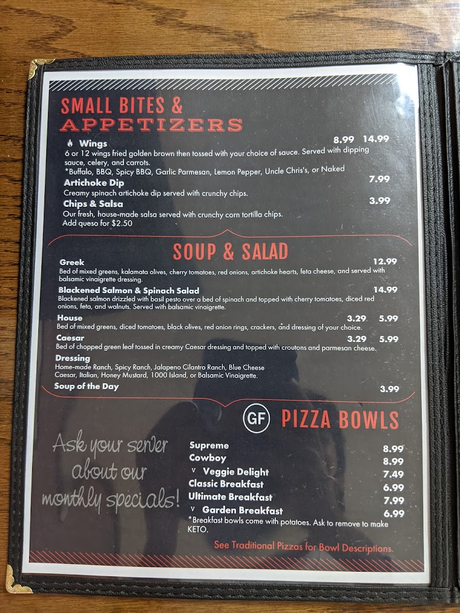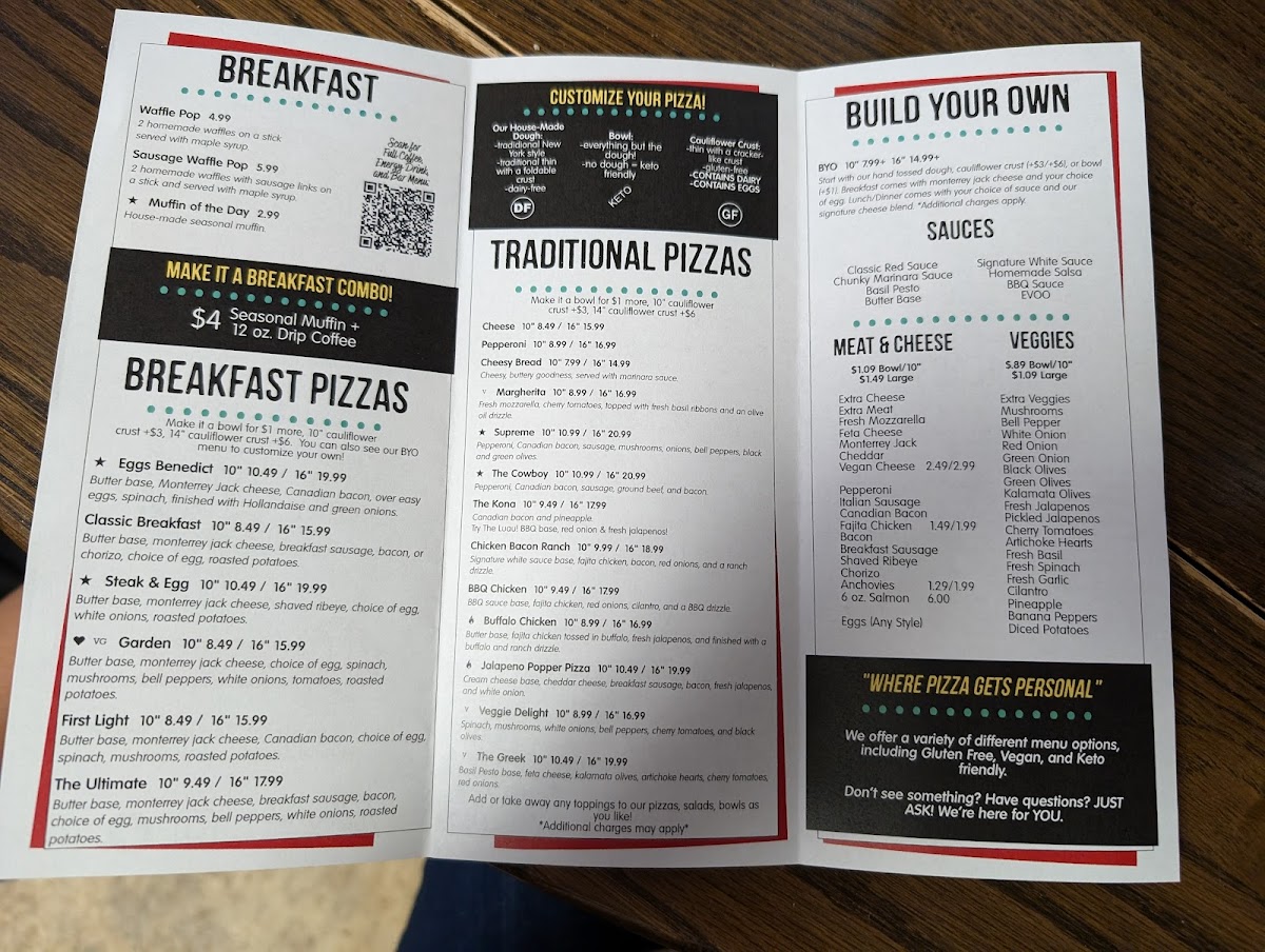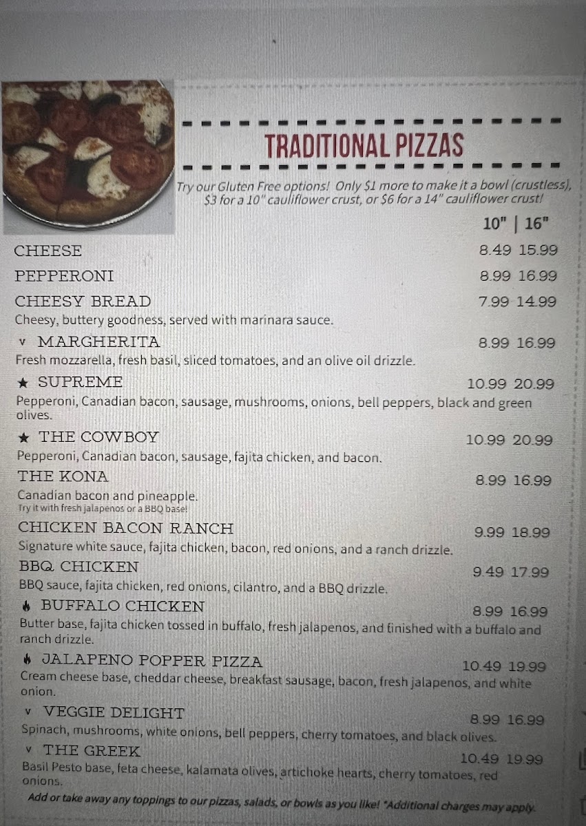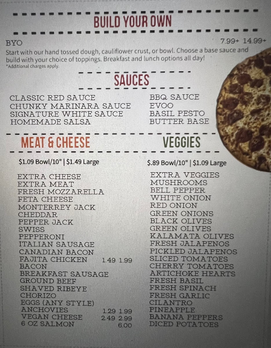 Start with our hand tossed dough, cauliflower crust, or bowl. Choose a base sauce and build with your choice of toppings.